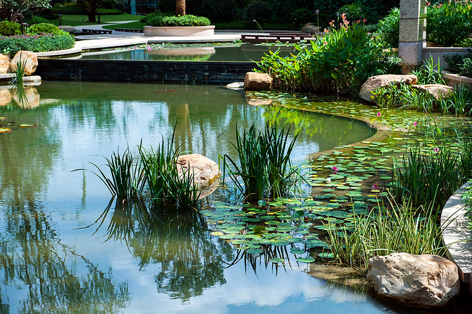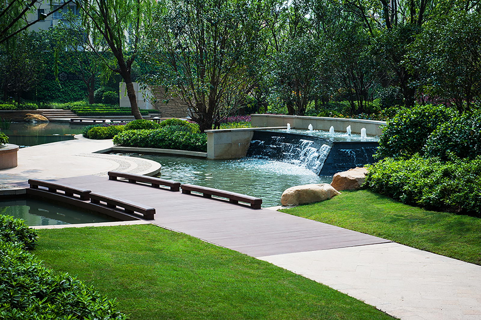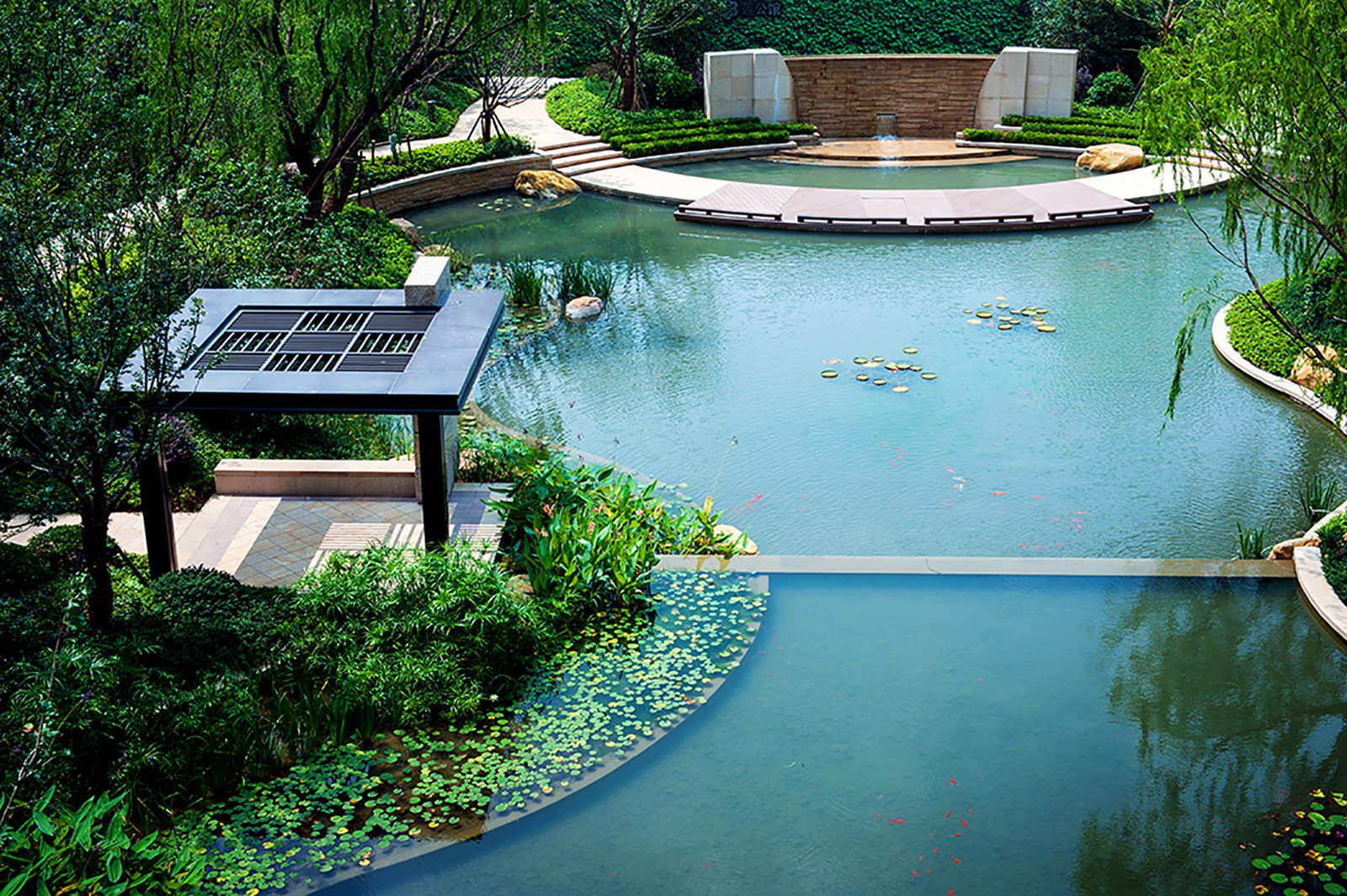 整個小區的景觀設計在當時借鑒日本人居設計思想,樓盤的總體定位即以高雅、藝術、自然共生為理念,融入精巧設計,對景觀細節進行了一一呈現,疊石理水,以“水岸共生、居隱書香”為主題,構筑蘊涵傳統園林的空間布局和現代園林精華的景觀環境。