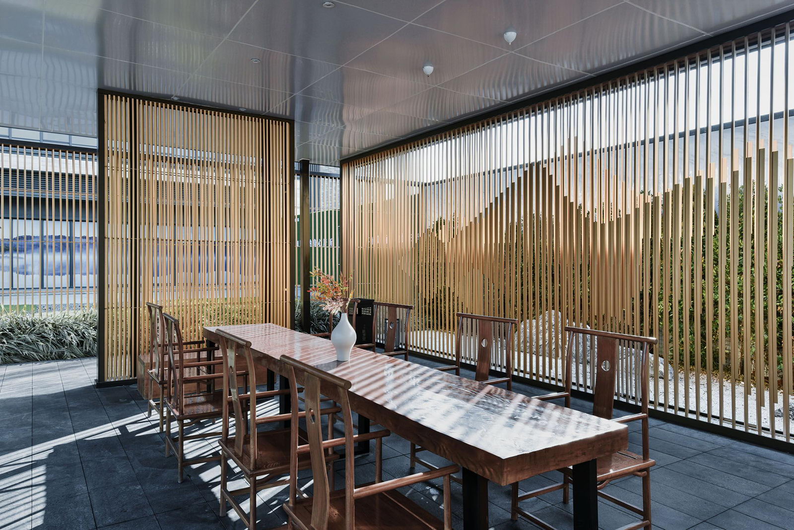 “L形”廊架給予客戶無形的引導,帶領客戶進入到更深層次空間,廊架頂板布置喜鵲藝術裝置,以雀幸喜歸為主題,引導賓客進入售樓部。