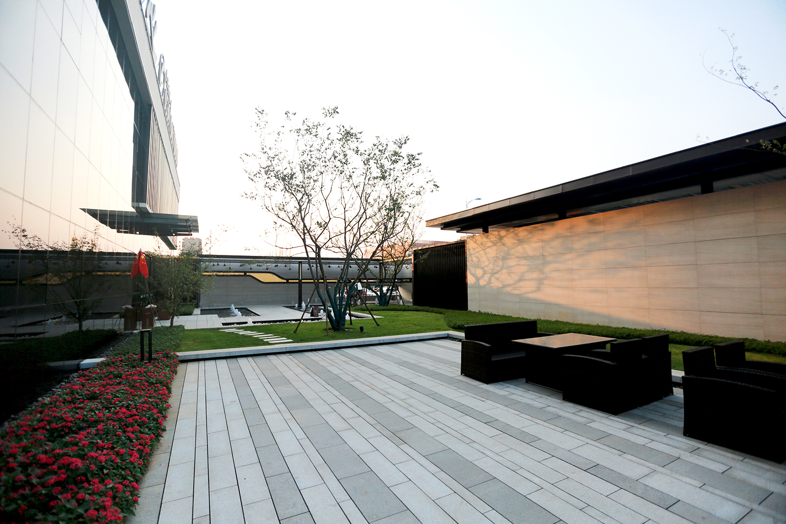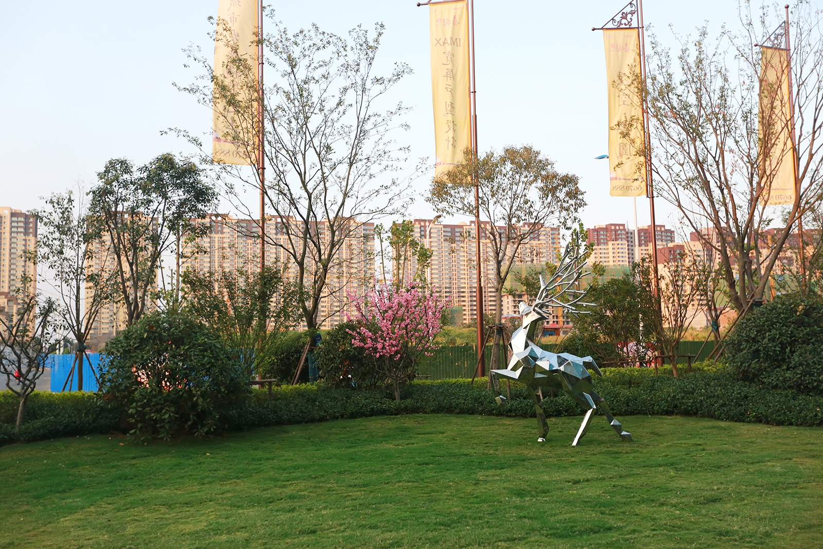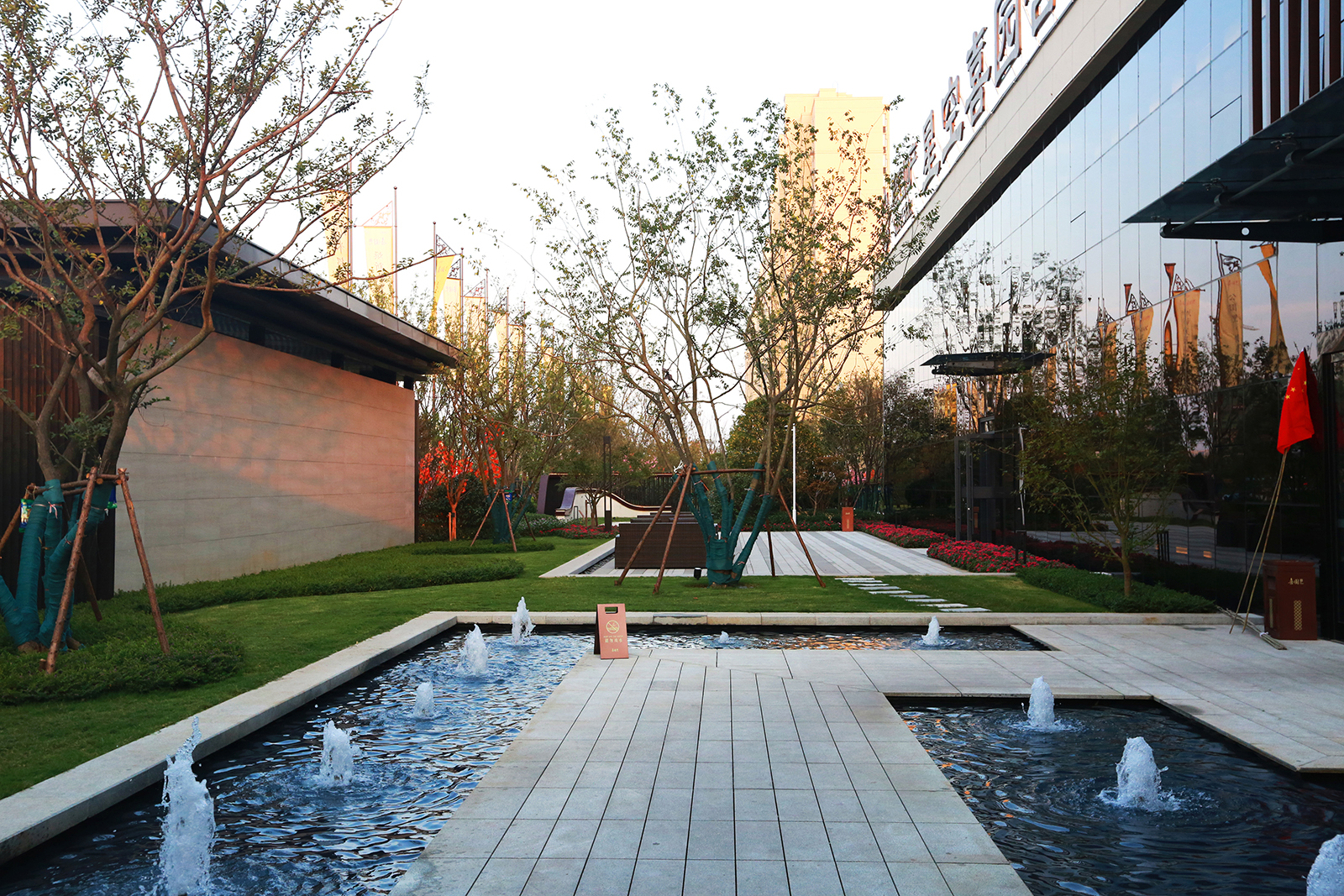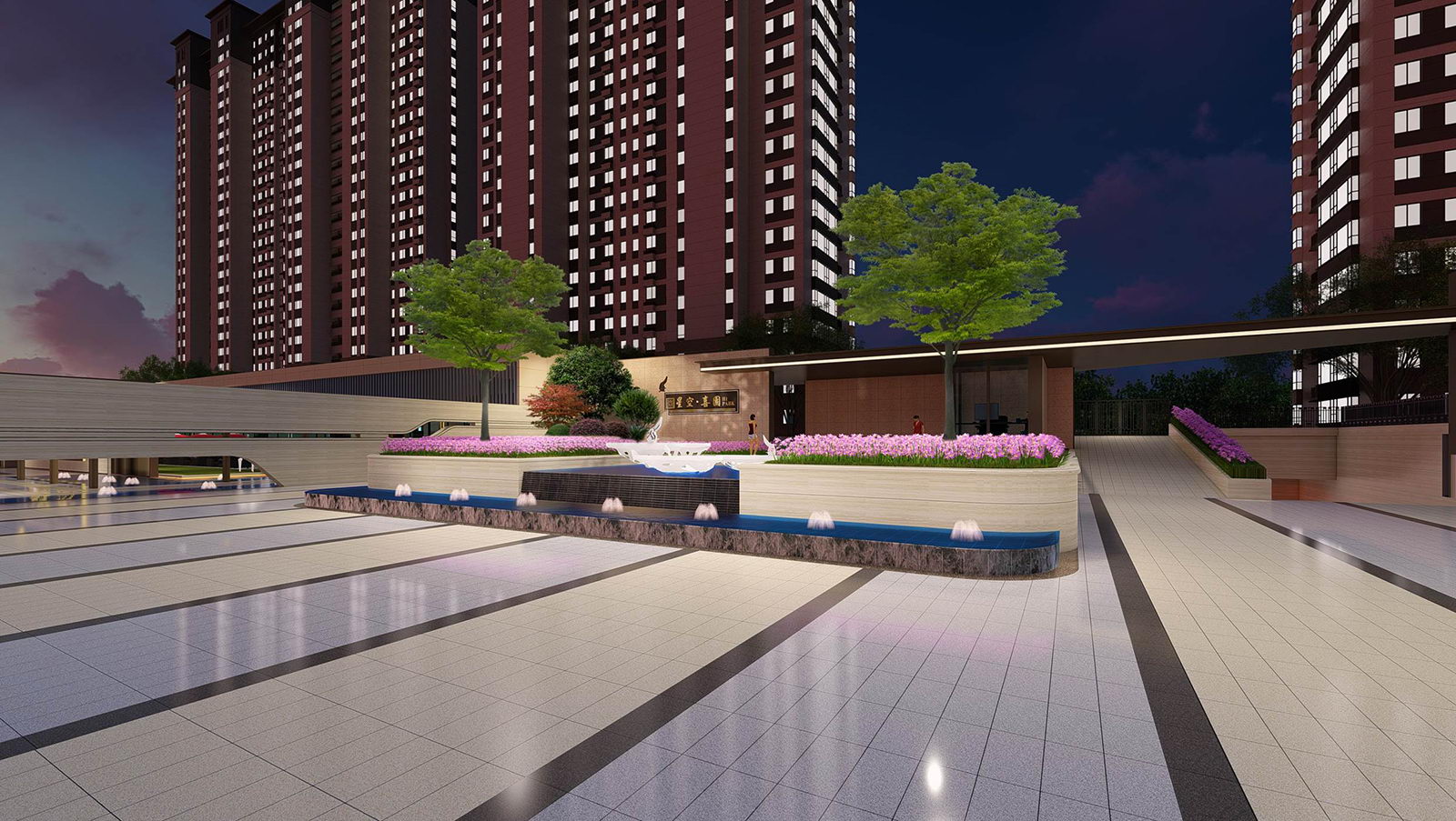 迎賓廣場平坦開闊,疊水水景與臺階組合現代、精致、優雅,水景布置有鵲歸巢主題雕塑,禮迎業主歸家,彰顯小區尊享品質。