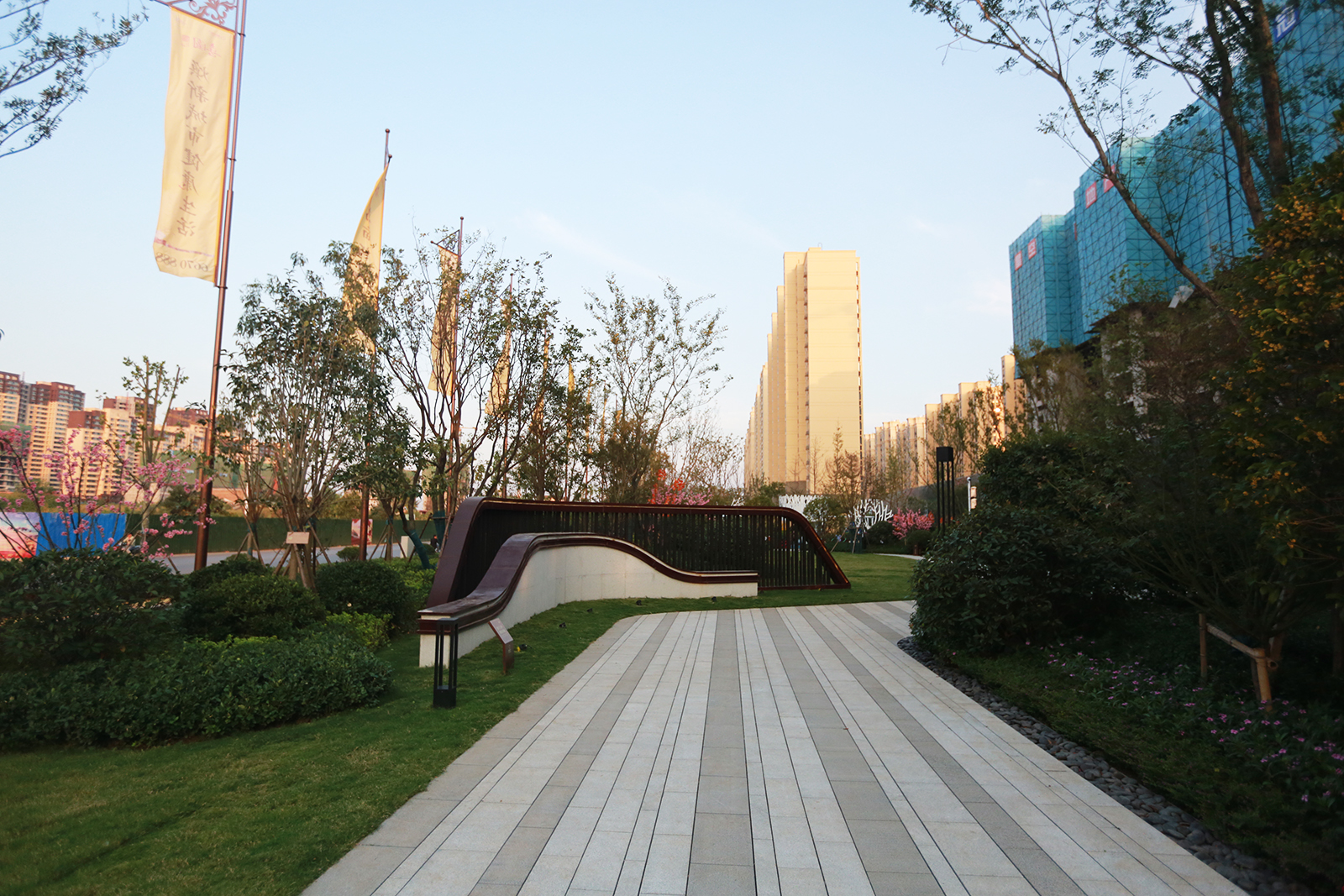 置業顧問引導客戶到達休閑平臺,空間開闊,綠植分布周圍,對景草階現代新穎,草坪上散布的藝術裝置增添景觀亮點,為客戶創造心曠神怡的身心感受,品味整個示范區的優雅品質。