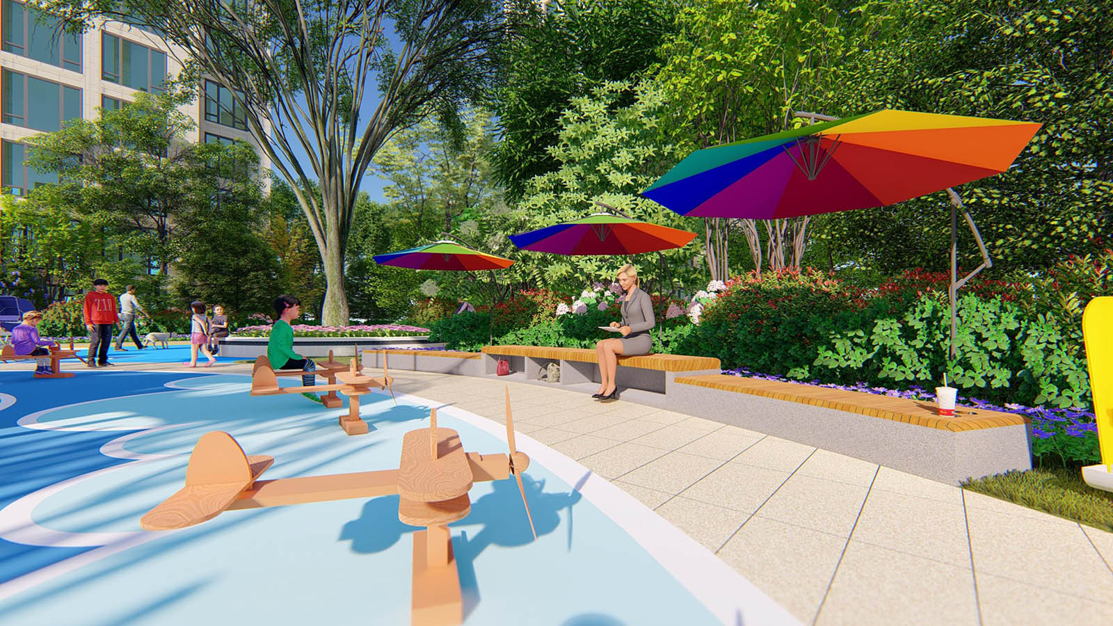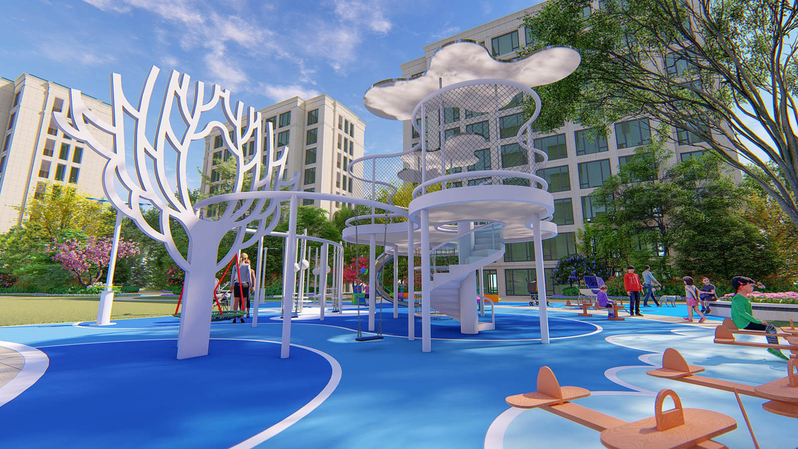 童夢樂園以“云鏡幻夢” 為設計主題,特別設計的云鏡主題滑梯為主景,讓兒童感受云與天空的幻夢鏡光倒影,配置夢幻風車、互動風車、飛行搖搖馬,如夢似幻,以幸福棲居、親子同樂為核心內涵,創造家長與兒童互動娛樂活動為主題的親子空間,深入研究兒童的戶外活動方式與形態,創造兒童友好社區,兼顧長輩的看護需求,通過新穎的互動性設計,調動兒童參與積極性,著力打造一個樂園級別的戶外兒童樂園。