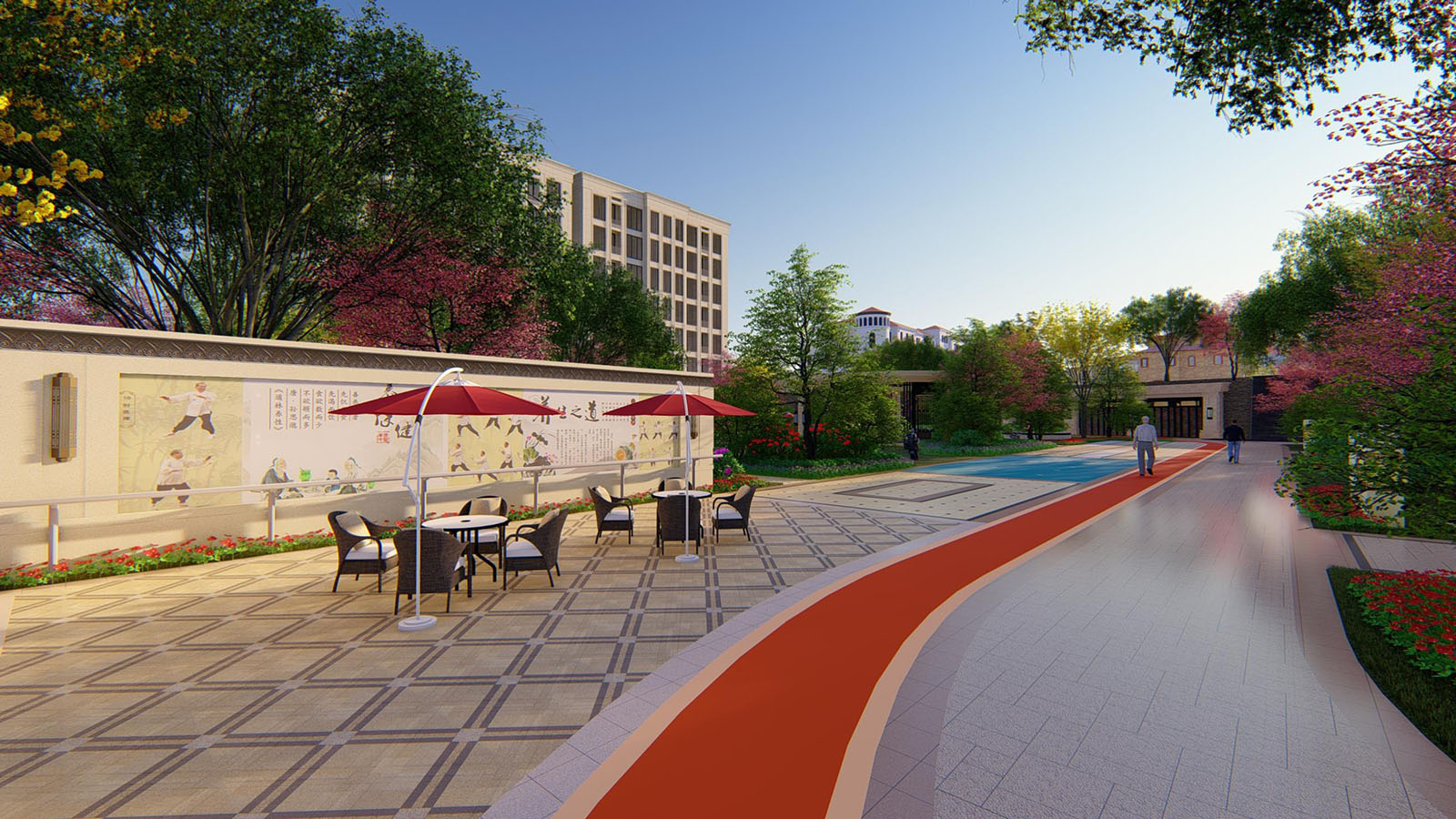 康樂花園包含太極健身區、棋牌娛樂區、康樂健身區、靜養休閑區、卵石康健步道五大功能,太極健身區設計太極點位,方便老人展開太極運動,通過對于黃山區當地生活習慣的深度調研,特別設計了棋牌娛樂空間,方便鄰里間在茶語飯后休閑時間,切磋棋牌游戲,特別強調林下空間,林蔭步道自然蜿蜒,曲徑通幽,將新古典風格下自然悅居,怡心養性描繪到極致,為老人創造安靜祥和的康樂空間。