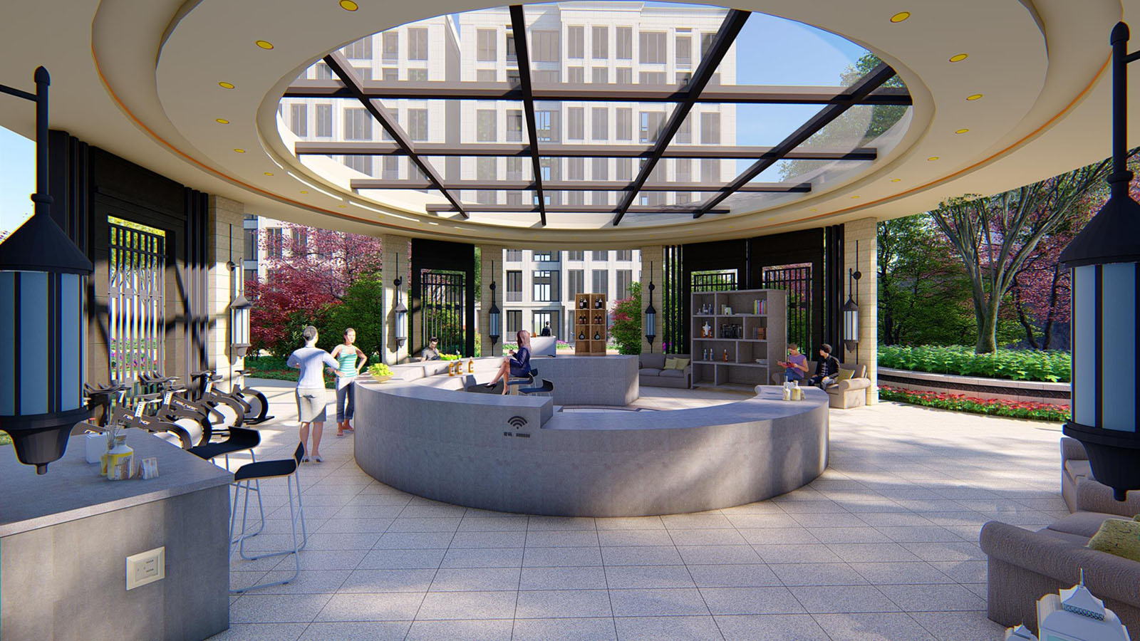 有溫度的社區,尤其注重景觀的實用性,在地塊最中心的區域,設計提煉共享鄰里中心的概念,讓景觀不單單只是一個簡單的構架,而是為居者日用的生活場所,萬物箱,共享書柜、母嬰臺,舒適的休閑沙發卡座、無線WiFi熱點,USB安全充電插口,業主可以在此會客、賞景、休閑、閱讀,同時具有戶外廚房的功能,布置的燒烤臺、烤箱,業主也可以在此燒烤、烘焙,陽光草坪溫潤舒適,讓居者與自然一體,靜享生活與美食,甚至在其中布置共享健身器械,即使在雨天也能享受健身鍛煉的樂趣。