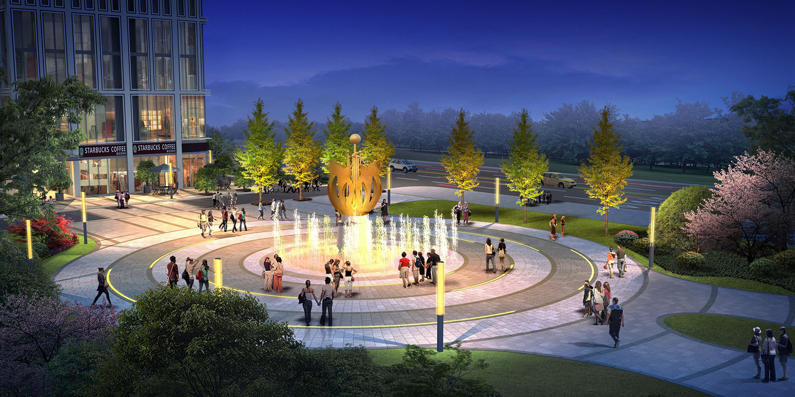 設計以市花石榴花為主題的景觀主題雕塑,寓意“石榴花開、安康歸來” ,將人文自然融入現代景觀廣場設計之中,寄托美好和諧寓意,致力將市民廣場打造成一個獨特、現代、新穎的城市新景點,提升商業氛圍。