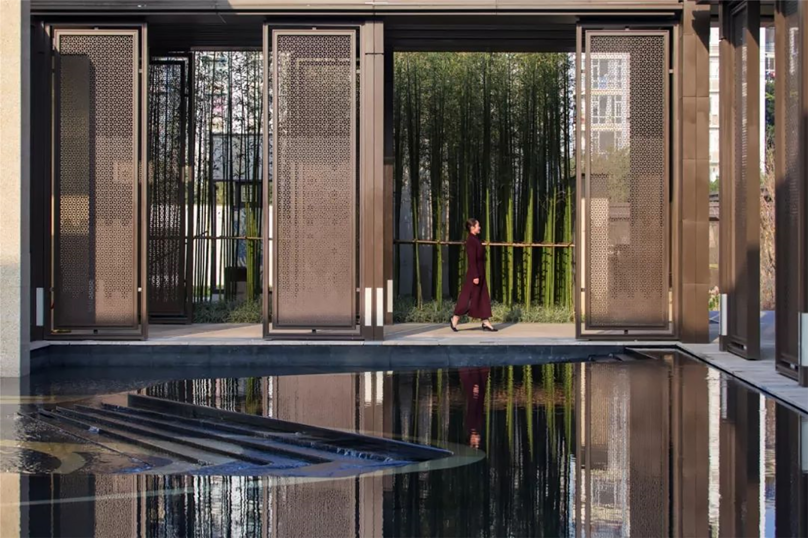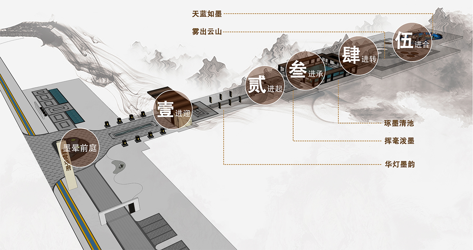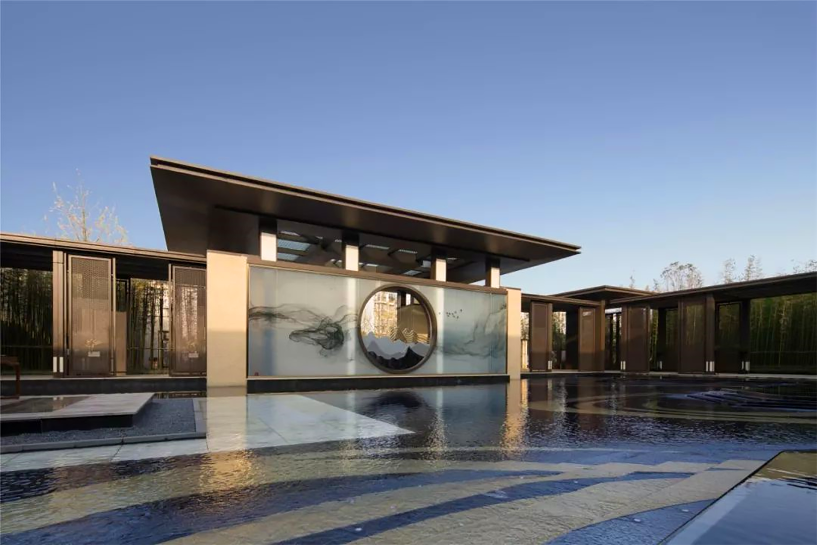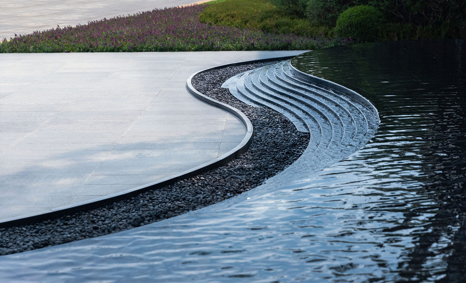 售樓處前場以硯石流墨為視覺焦點(diǎn),黑色肌理猶如一方硯臺,水景層層疊疊,如水墨輕流,水墨文鋪裝如丹青一抹煙雨濃,墨香氤氳氣韻生,不只是宣紙上走筆才能暈染出水墨的虛幻與自由。