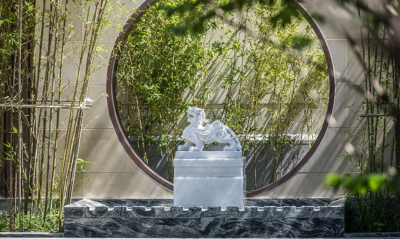 作為一進(jìn)、三進(jìn)之間的起承過渡空間,整個空間采用空寂手法,舒朗雅致,對景景墻,猶如大墨揮毫,筆下千變,雄渾激蕩,勢如卷席,一副天下風(fēng)云乾坤鋪陳于上,令人胸懷更為寬廣,氣度尤為從容。