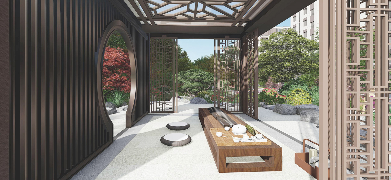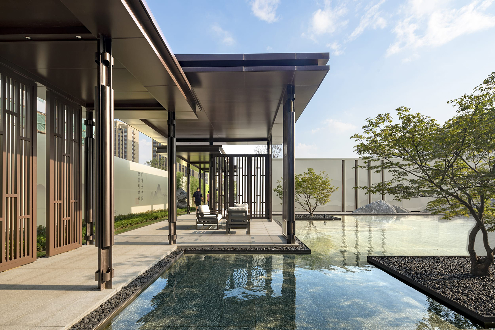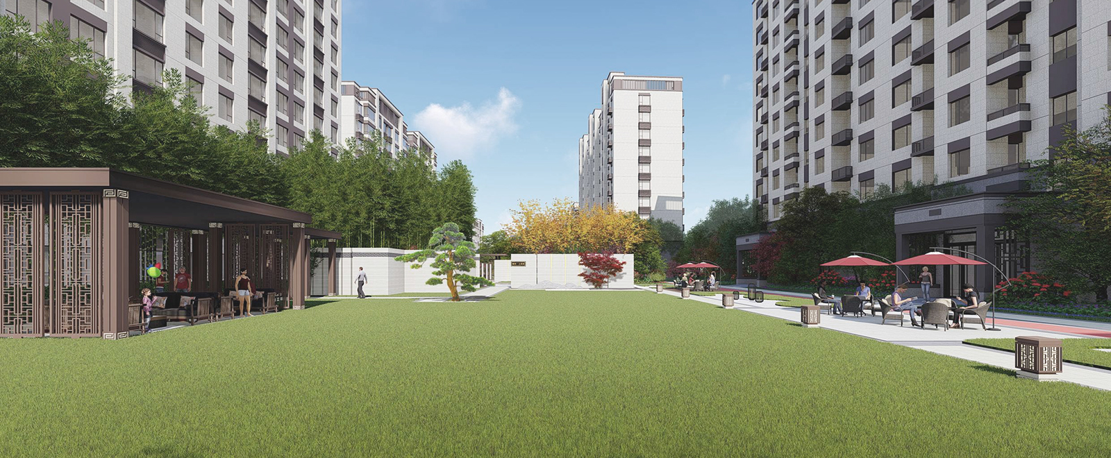 在全區最為開闊,陽光最為充足的地段,自然而然,大氣舒緩的陽光大草坪,因時因地而生,在對景照壁虛實掩映之后,場地瞬間展開,追求極致的簡雅之中給業主帶來的是最溫暖的身心感受,再之后,又在一曲一折中將人引導之山水園,整個二進院作為景觀會客中庭,會客、訪友,三五知己,闊談人生,閑適愜意。