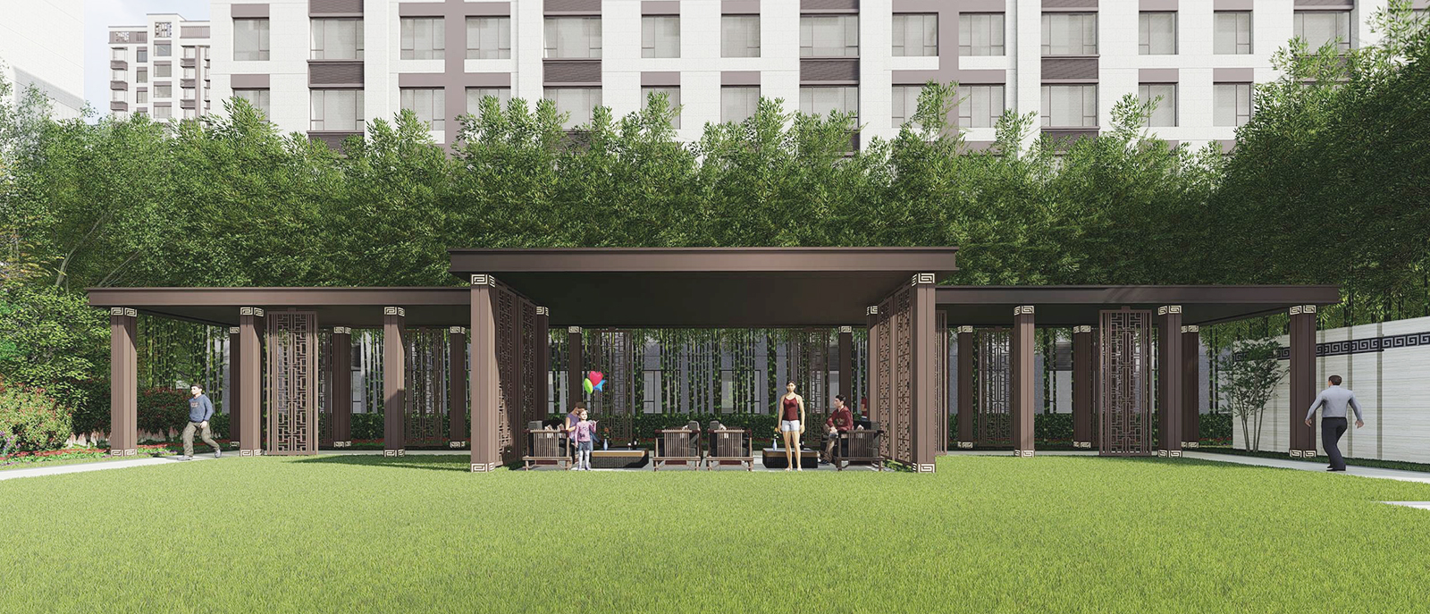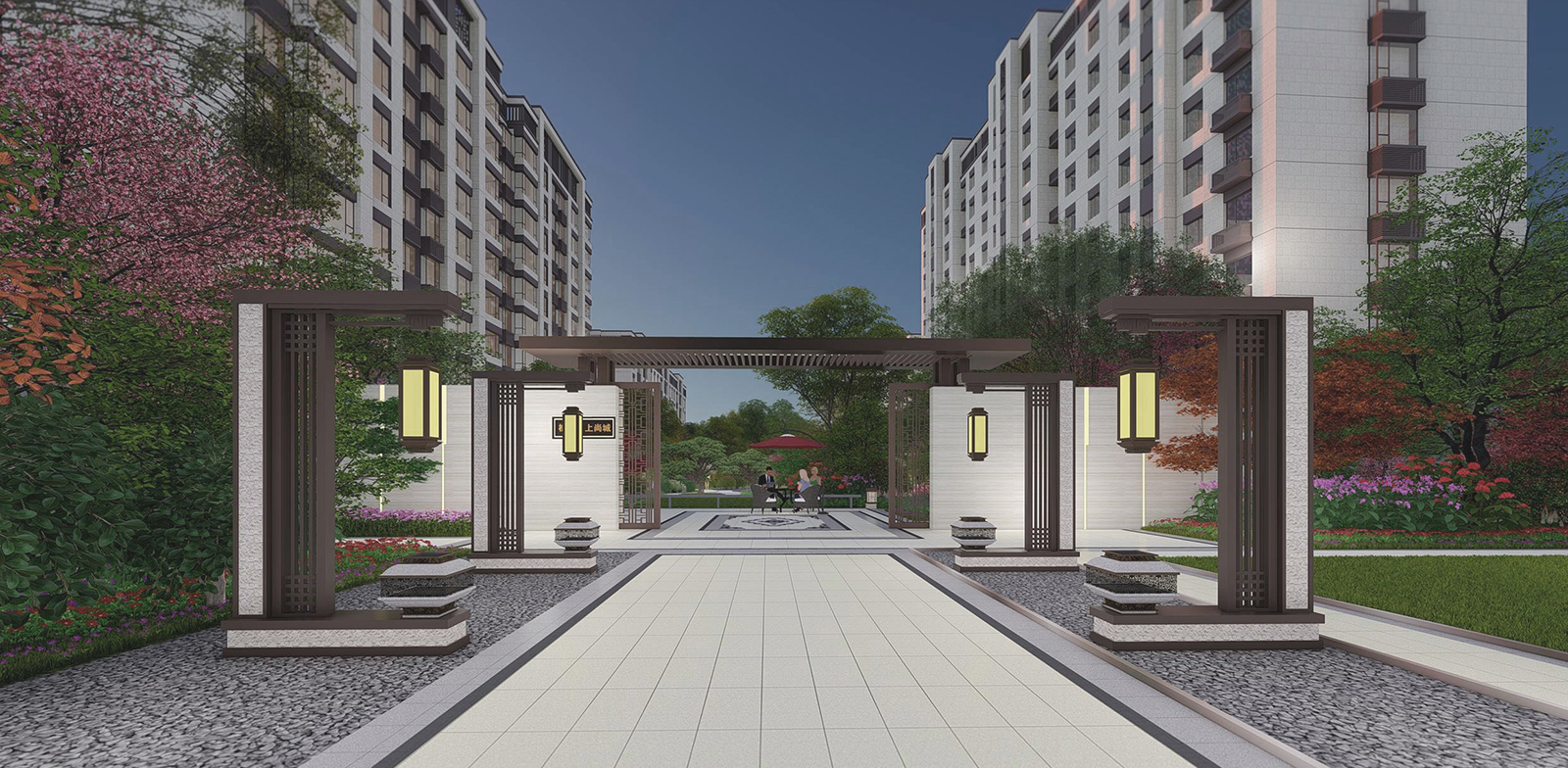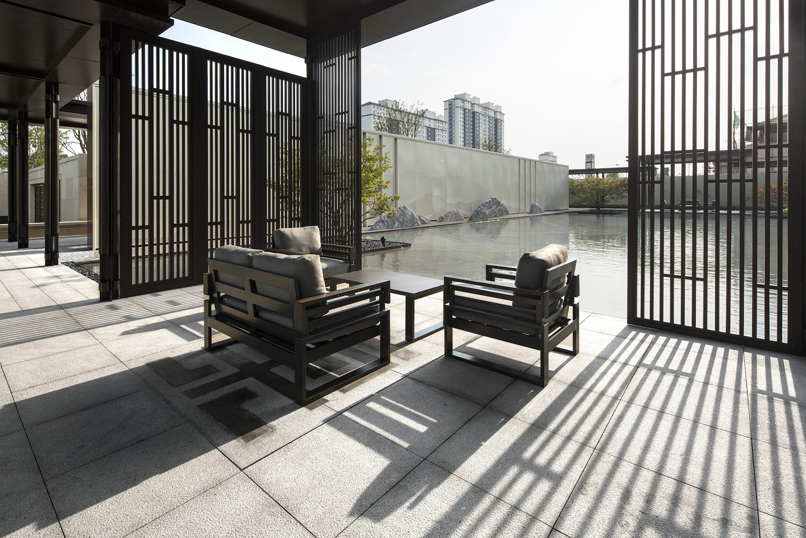 在全區最為開闊,陽光最為充足的地段,自然而然,大氣舒緩的陽光大草坪,因時因地而生,在對景照壁虛實掩映之后,場地瞬間展開,追求極致的簡雅之中給業主帶來的是最溫暖的身心感受,再之后,又在一曲一折中將人引導之山水園,整個二進院作為景觀會客中庭,會客、訪友,三五知己,闊談人生,閑適愜意。