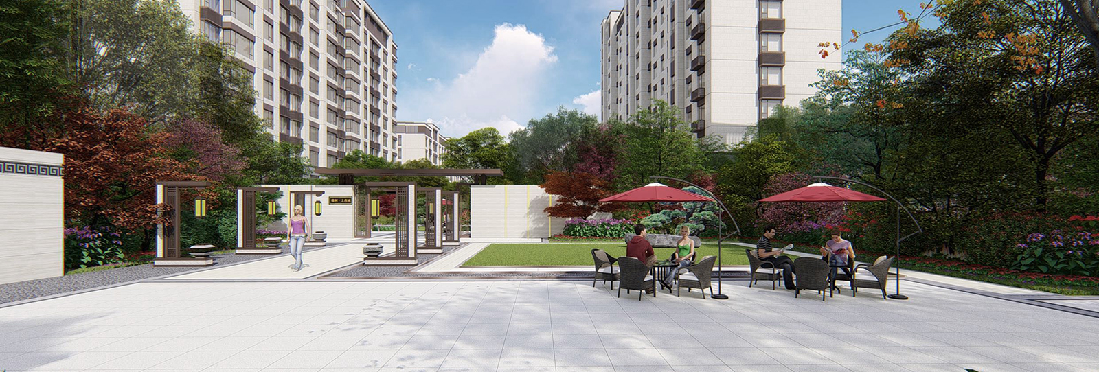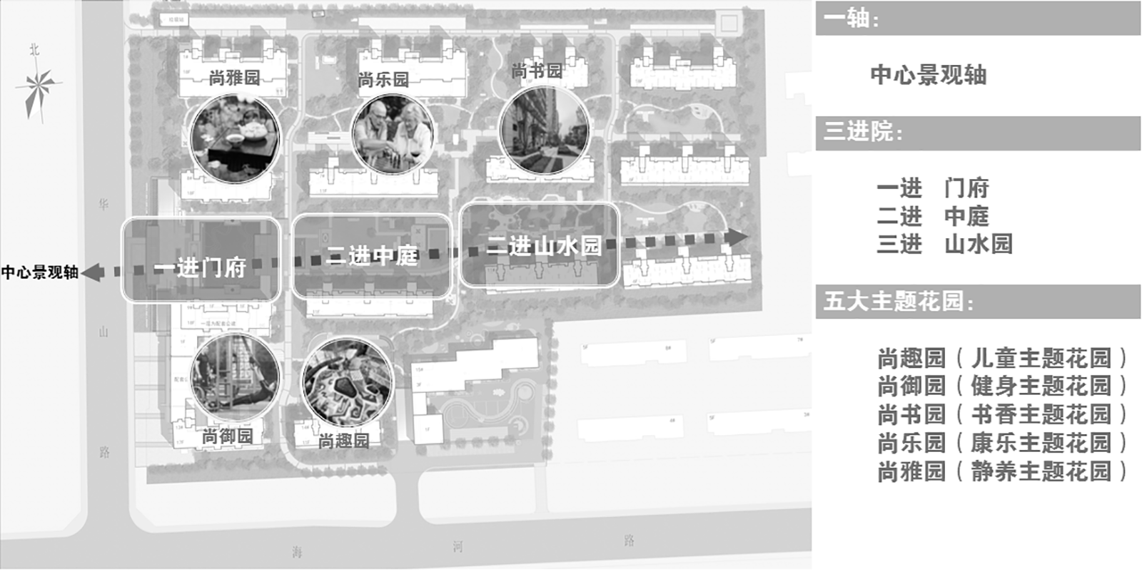 一軸、三進院,五大主題宅間景觀,以顯勢,迎客 、閑游、幸福悅居貫穿始終,采用現代、輕靈的中式設計手法 ,見徐東方意境元素 。