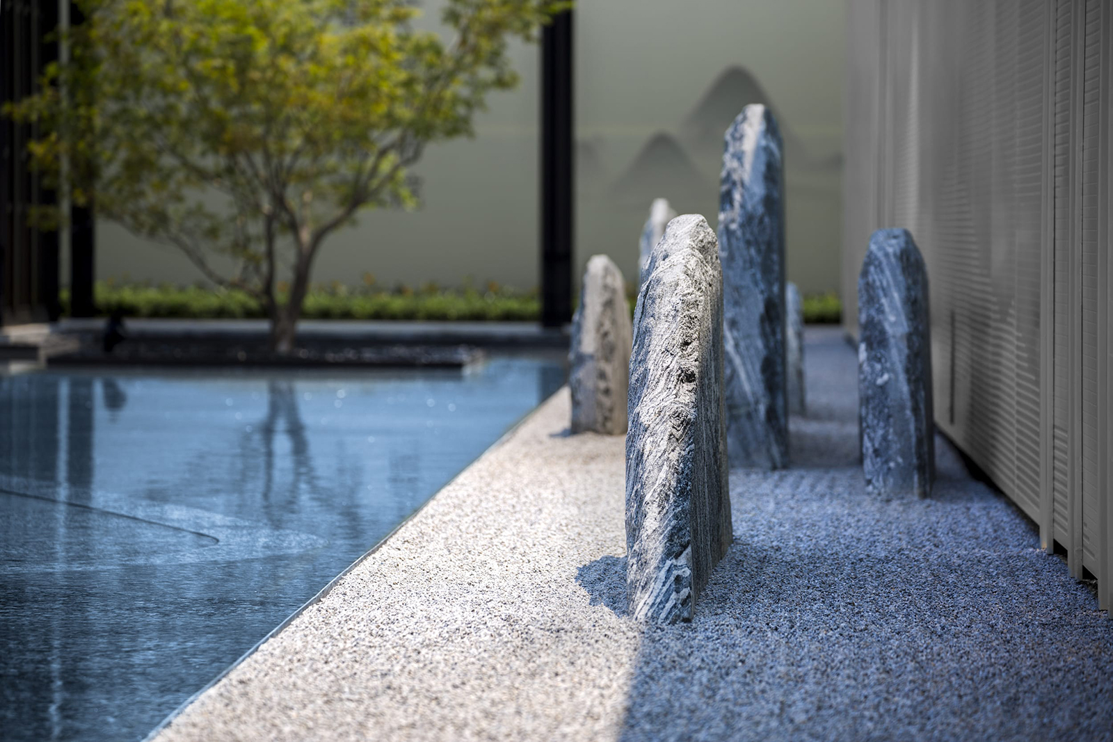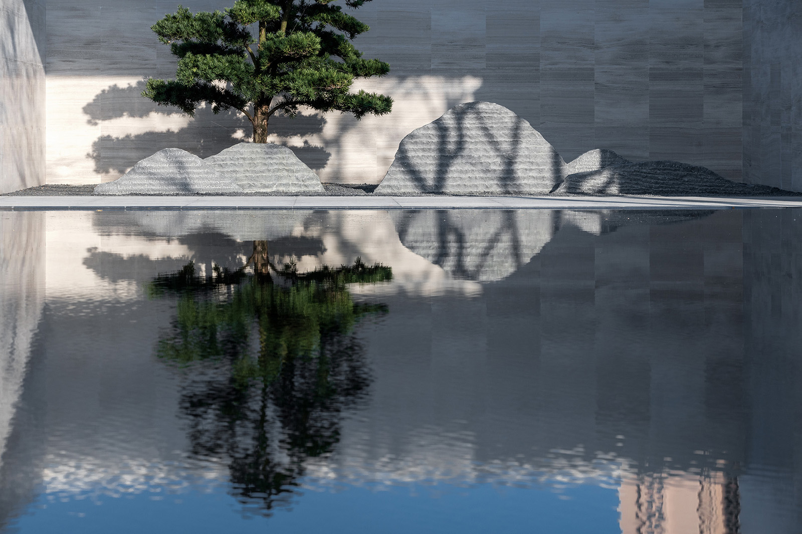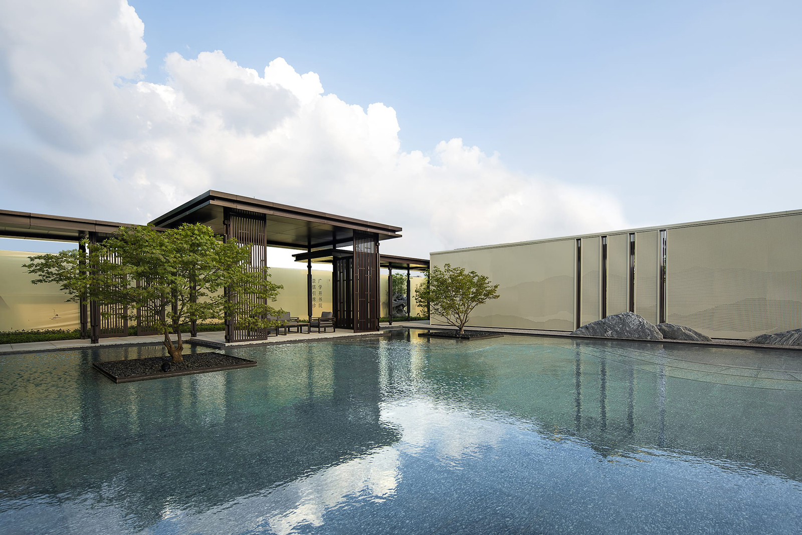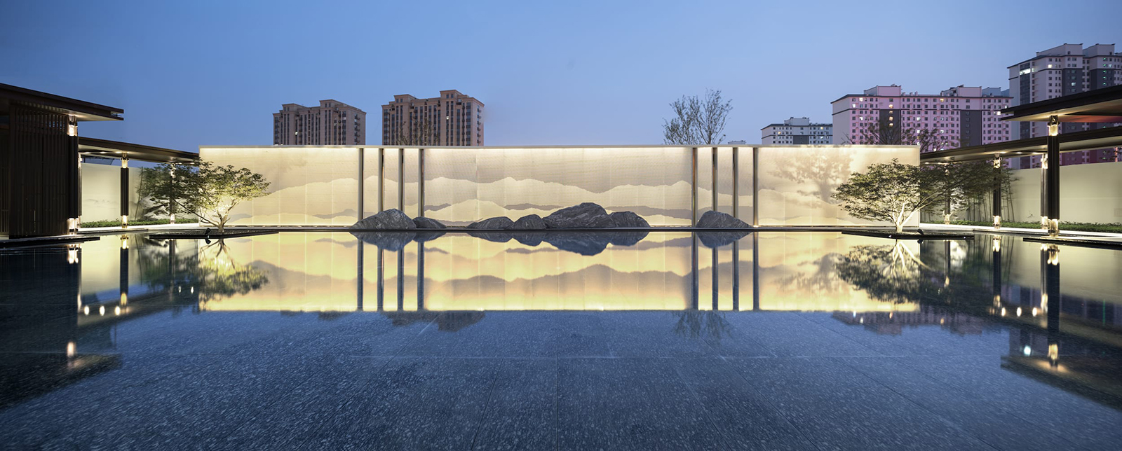 “水利萬物而不爭”,入口府門與造型景石疏導人車動線,以“迎·入境壺天,禮·天宇空明——境·圖云境水”為展示序列,層層遞進。可所謂“入則壺天自春”,清凈悠然。對景景墻巍峨大氣,通過風雨連廊,見中軸線大尺度水景,如銀河望月,藏風納氣。水景曲線如群山往復,流水潺潺,禮儀燈光步道,靜謐舒心,大氣、精致、從容。